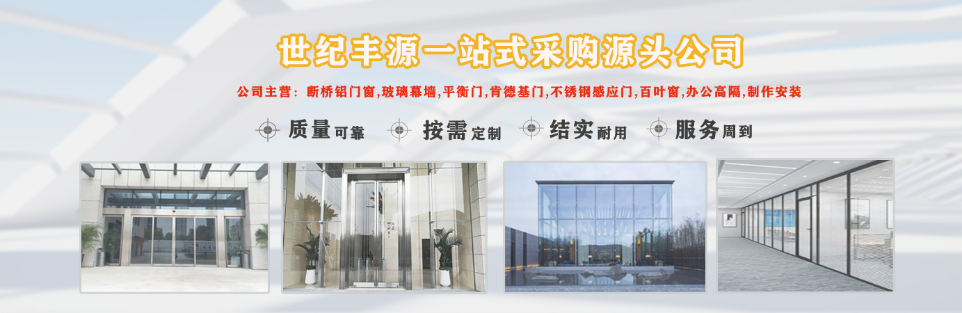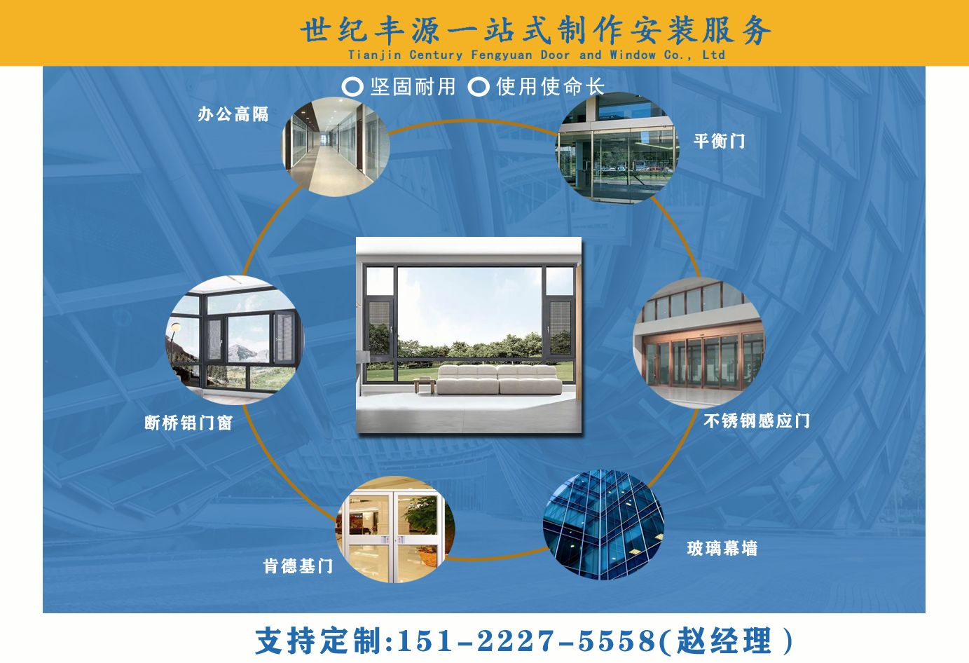 天津世紀豐源門窗有限公司從事斷橋鋁門窗,玻璃幕墻,平衡門,肯德基門,不銹鋼感應門,百葉窗,辦公高隔,制作安裝一站式訂制生產及配套服務等。 公司自成立以來,始終堅持以人才為本、誠信立業的經營原則,薈萃業界精英,成熟的技術、管理方法及企業經驗與國內企業的具體實際相結合,為企業供給各個方面的解決方案,使企業在激烈的市場競爭中始終堅持競爭力,實現企業快速、穩定地發展。 質量好、服務好、才能信譽好,公司已在諸多領域取得輝煌成績,愿意成為您可信賴的長期合作伙伴?! ∽屛覀償y手同行,共同實現“讓普通老百姓都用得上高端門窗”...